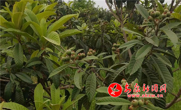 “再過20來天枇杷就成熟了”,杜山青指著大片枇杷林說。青翠欲滴的枇杷樹長勢正旺,隨意撥開巴掌大的墨綠色枇杷葉,就露出了一串串如珍珠般大小、青綠色的枇杷果。