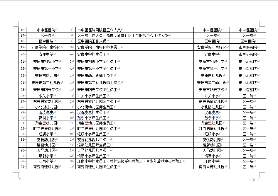 漢濱區(qū)老城街道、新城街道轄區(qū)重點(diǎn)人群:一是黨政機(jī)關(guān)、企事業(yè)單位返崗人員,中小學(xué)校、幼兒園返校人員;二是“五一”假期有市域外旅居史人員;三是41類重點(diǎn)人群;四是市域外來安返安核酸檢測結(jié)果超過48小時(shí)人員;五是愿檢人員。