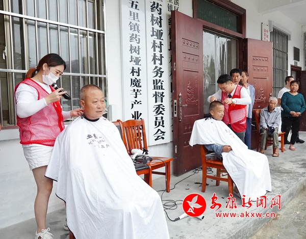7月19日一大早,五里鎮(zhèn)藥樹埡村熱鬧非凡。很多村民陸續(xù)趕到村委會,排隊理發(fā)。“我平常理發(fā)要去鎮(zhèn)上,來回一趟得兩三個小時,還要花二三十的車費。這次有人來免費給我們理發(fā),真開心。”剛理完發(fā)的曹德秀阿姨高興地說。