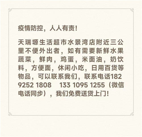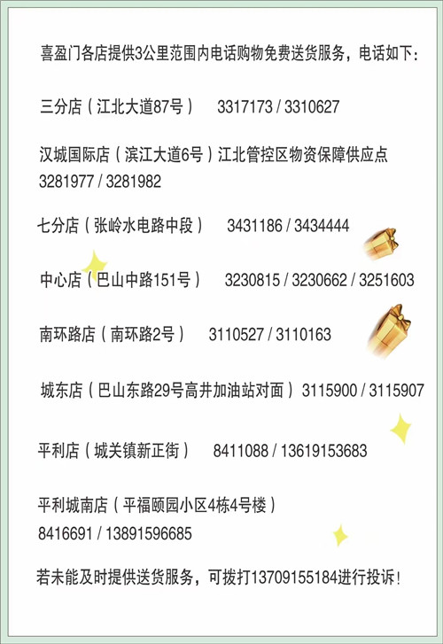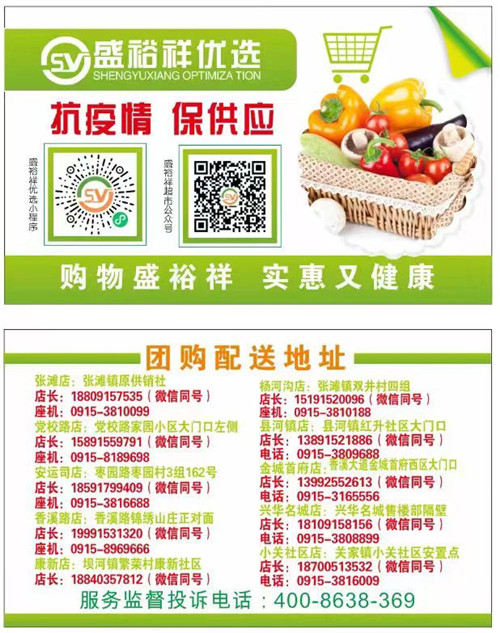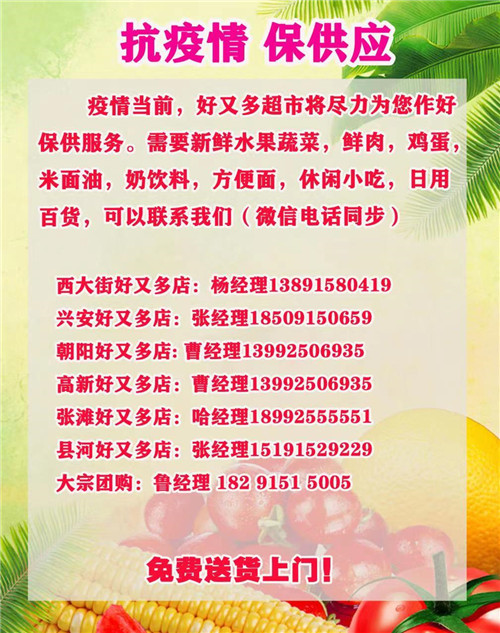 為滿足廣大市民群眾生活必需品的購買需求,避免因人群聚集造成的交叉感染風險,漢濱區(qū)經貿局組織漢濱中心城區(qū)多家保供企業(yè)(超市)推出免費送貨服務,市民朋友可撥打就近購物店電話,各商家將盡心盡力為大家做好服務,解決您的購買需求。PvN安康新聞網