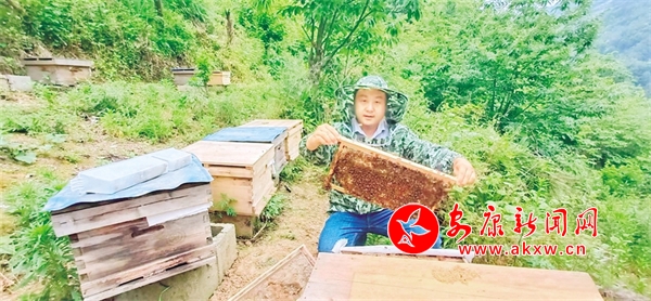 2016年,江鑫養(yǎng)了3箱蜜蜂,但由于經(jīng)驗(yàn)不足,3箱蜜蜂飛跑了2箱,于是江鑫就按照河南夫妻的經(jīng)驗(yàn)細(xì)心養(yǎng)殖,小心呵護(hù),2017年由1箱蜜蜂繁殖發(fā)展到50多箱蜜蜂,在黃泥村“兩委”的支持下他還成立了養(yǎng)蜂合作社。2018年,又繁殖發(fā)展40箱蜜蜂,在漢濱區(qū)文化和旅游廣電局的幫扶指導(dǎo)下,江鑫同時(shí)享受了漢濱區(qū)扶貧政策的獎(jiǎng)勵(lì)扶持資金8000元,當(dāng)年賣出蜂蜜200多公斤,價(jià)格200元一公斤;2019年又發(fā)展200多箱蜜蜂,當(dāng)年賣出了500多公斤蜂蜜,收入10多萬元,他自己也成了養(yǎng)蜂“土專家”,很多當(dāng)?shù)乩习傩障蛩麑W(xué)習(xí)養(yǎng)蜜蜂的技術(shù),他毫不保留地傳授養(yǎng)蜂技術(shù),還給他們提供中華蜂種、蜂箱,幫助他們?cè)诰W(wǎng)上銷售蜂蜜。目前,江鑫已經(jīng)帶動(dòng)30多戶群眾一起發(fā)展“甜蜜”事業(yè)。