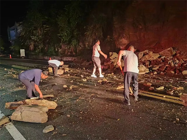“G211省道,陽坡村9組瀛湖加油站對面山體發(fā)生嚴(yán)重塌方,大量落石滾落堆積在主干道路上,嚴(yán)重危及來往車輛行車安全。”7月18日凌晨1:58分,一道尖銳的手機(jī)鈴聲將陽坡村黨支部書記晏真云從睡夢中驚醒,在得到消息后,陽坡村四支隊(duì)伍迅速集結(jié),帶著鐵鍬、手套等工具第一時(shí)間沖向塌方路段,對落石及淤泥進(jìn)行清理搬運(yùn)。
