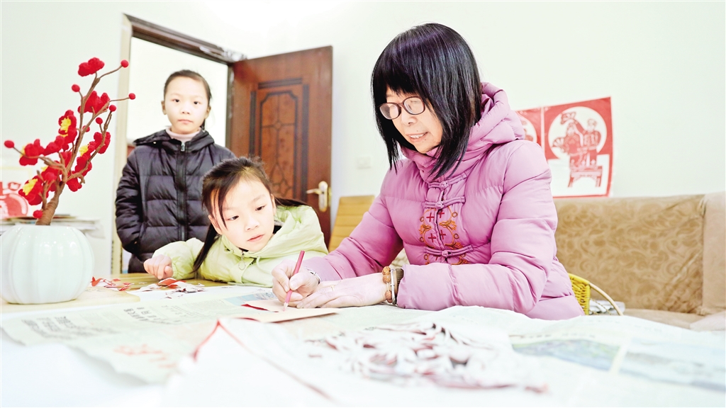 馮增慧教兩個(gè)孫女學(xué)剪紙 羅妍 攝