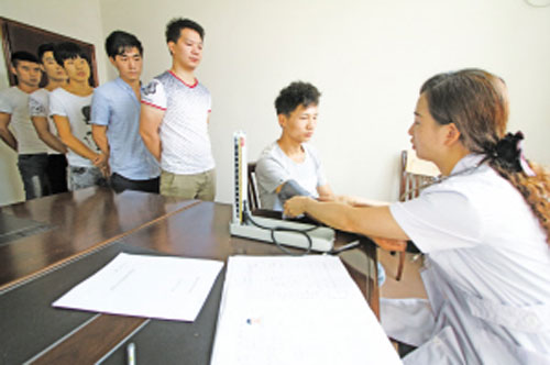 8月10日,在漢濱區(qū)人武部,前來應(yīng)征入伍的適齡青年正按照順序接受各項(xiàng)檢查。當(dāng)日,我市2015年夏秋季征兵體檢工作拉開帷幕。市委常委、軍分區(qū)司令員高興平出席開檢……