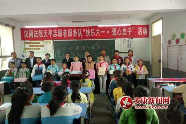 5月27日,漢陰縣人民法院天平志愿服務(wù)隊5余名志愿服務(wù)者冒雨從縣城驅(qū)車50余公里,走進漩渦鎮(zhèn)堰坪小學,將60余份裝有乒乓球拍、圖書、文具等學習用品的“愛心盒子”送到留守兒童手中,讓孩子們感受“六一”的快樂。