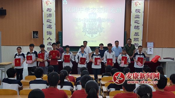 安康新聞網(wǎng)訊(通訊員 涂紅蓮)6月20日下午兩點,漢陰中學(xué)首屆“衣戀陽光班”2016-2017學(xué)年助學(xué)金發(fā)放儀式在該校階梯教室隆重舉行。市縣慈善協(xié)會、縣教體局、漢陰中學(xué)相關(guān)領(lǐng)導(dǎo)出席,50名品學(xué)兼優(yōu)的受助貧困學(xué)生參加發(fā)放儀式。