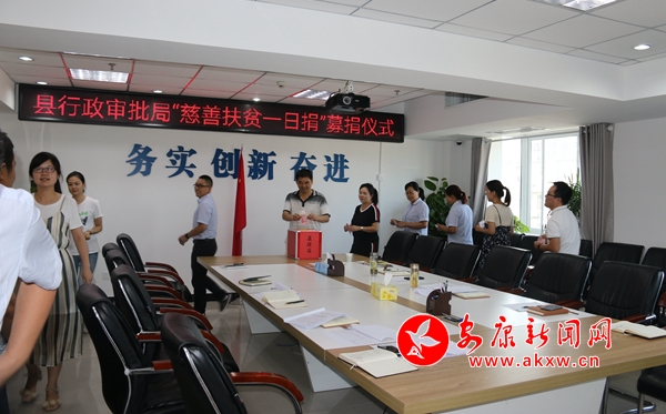 8月29日下午,在縣行政審批局的宣傳發(fā)動(dòng)下,局領(lǐng)導(dǎo)班子帶頭,全體黨員干部踴躍參與,一些因公出差或公休不能到場(chǎng)的同志也積極響應(yīng),慷慨解囊,委托同事代為捐款,表達(dá)自己的愛心和對(duì)慈善扶貧事業(yè)的支持。