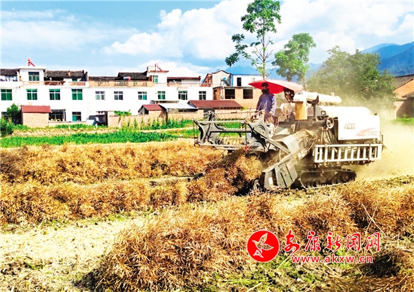 為支持農(nóng)戶實現(xiàn)夏糧豐收,力保油菜籽顆粒歸倉,該鎮(zhèn)協(xié)調(diào)30余臺收割機投入油菜收割。4臺收割機正穿梭于五一村三組的油菜地里,收割、脫粒、秸稈還田,整個收割過程一氣呵成?粗约3畝的油菜地在半小時內(nèi)就完成收割,村民成芳難掩心中的喜悅。