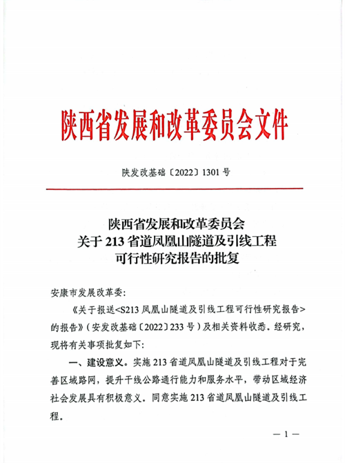 近日,省發(fā)改委下發(fā)文件,對(duì)213省道鳳凰山隧道及引線工程可行性研究報(bào)告予以批復(fù),同意213省道鳳凰山隧道及引線工程實(shí)施,標(biāo)志該項(xiàng)目進(jìn)入實(shí)質(zhì)許可階段,為今年開(kāi)工奠基堅(jiān)實(shí)基礎(chǔ)。