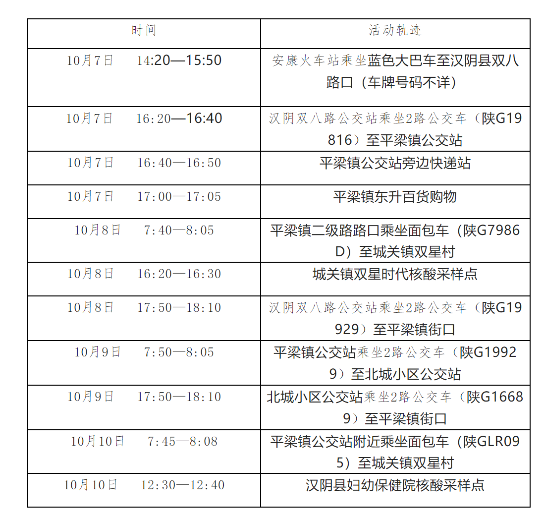 根據(jù)流調(diào)情況,現(xiàn)將外市核酸檢測陽性病例涉及密切接觸者在漢陰縣的公共場所活動軌跡公布如下:
