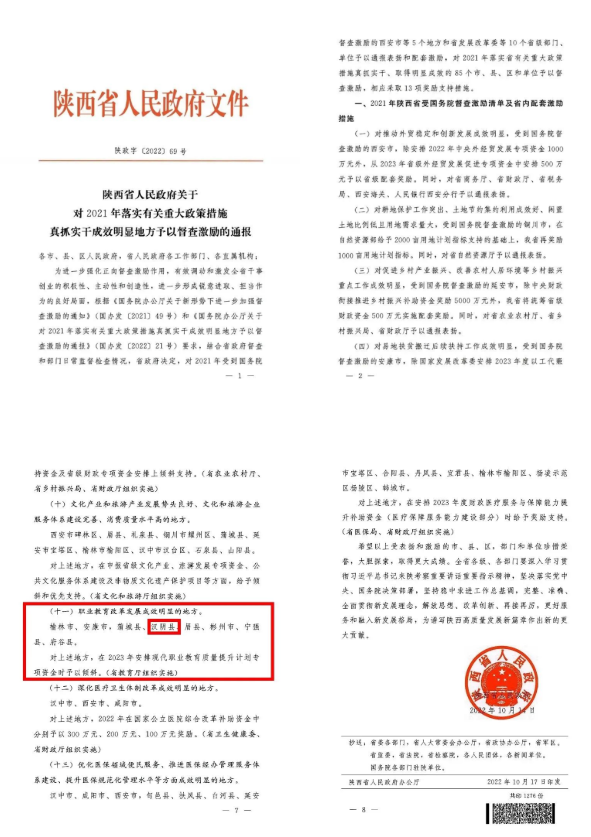 從陜西省人民政府文件《陜西省人民政府關(guān)于對2021年落實有關(guān)重大政策措施真抓實干成效明顯地方予以督查激勵的通報》(陜政字[2022]69號)獲悉,漢陰縣獲評2021年度職業(yè)教育改革發(fā)展成效明顯縣。此次全省共六個縣區(qū)榮獲職業(yè)教育改革發(fā)展成效明顯縣,漢陰縣名列其中。陜西省教育廳將在2023年安排現(xiàn)代職業(yè)教育質(zhì)量提升計劃專項資金時對漢陰縣予以傾斜。