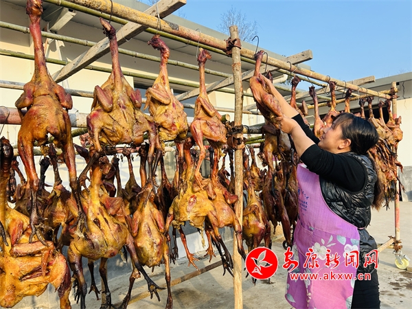 進(jìn)入臘月,位于大山深處的鐵佛寺鎮(zhèn)共同村也熱鬧了起來(lái),一大早,共同村經(jīng)濟(jì)合作社負(fù)責(zé)人章漢和工人們正忙著加工制作熏雞,據(jù)加工師傅曹承香介紹,熏雞是將在桑園地露天放養(yǎng)的土雞屠宰后,輔以農(nóng)家秘制佐料腌制,并進(jìn)行晾曬、煙熏,制作出的熏雞色澤金黃、肉質(zhì)緊致、口感極佳。2021年開(kāi)始,共同村合作社利用生態(tài)優(yōu)勢(shì),以當(dāng)?shù)厣B(yǎng)土雞為原材料,用傳統(tǒng)的熏制臘味的工藝開(kāi)始制作熏雞。