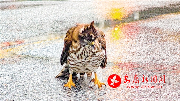 當(dāng)天下午四點四十分左右,周文棋一家駕車行至漢漩路14公里處,一只蜷縮著的大鳥擋住了去路,下車一看,是一只羽毛被淋濕的野生鳥類,無論過往車輛如何鳴笛,這只大鳥依然一動不動。