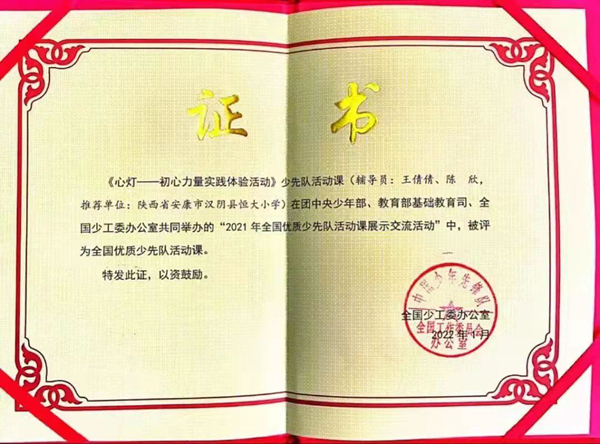 本網(wǎng)訊(通訊員 林愛銘)近日,共青團中央少年部、教育部基礎教育司、全國少工委辦公室公布了“2021年全國優(yōu)質少先隊活動課”名單。漢陰縣恒大小學選送的少先隊活……