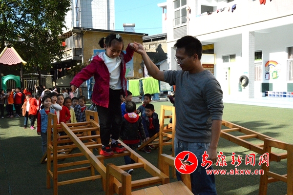 在嵐皋縣第二幼兒園,來自新北區(qū)銀河幼兒園教師魏劍正和小朋友們在室外活動(dòng),在他的不斷引導(dǎo)鼓勵(lì)和示范帶動(dòng)下,小朋友們大膽嘗試高空過木橋。
