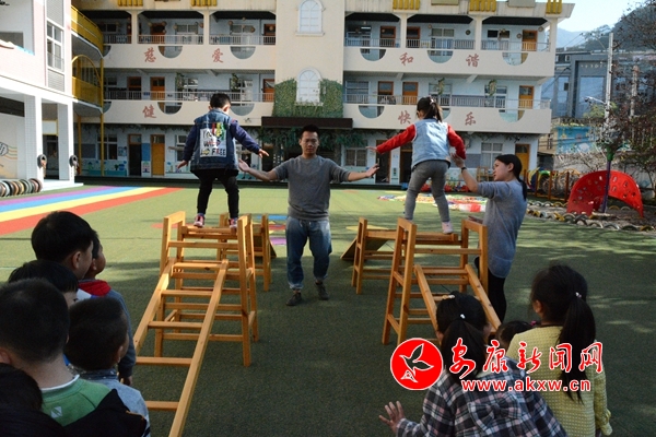 在該縣第二幼兒園,來自新北區(qū)銀河幼兒園教師魏劍正和小朋友們在室外活動,在他的不斷引導(dǎo)鼓勵和示范帶動下,小朋友們大膽嘗試高空過木橋。c4K安康新聞網(wǎng)