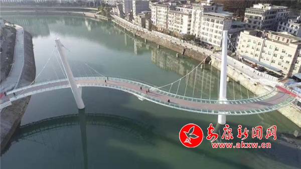 無人機(jī)拍攝的剛建成的嵐皋縣城嵐河人行橋。陳延安/攝