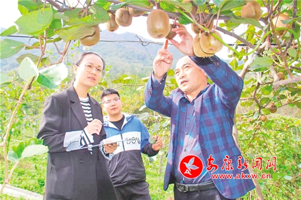 縣農(nóng)業(yè)農(nóng)村局高級農(nóng)藝師、科技特派員謝利華,帶領(lǐng)科研團隊在基地記錄不同區(qū)域獼猴桃品種生長情況,采收獼猴桃新品準備送檢。