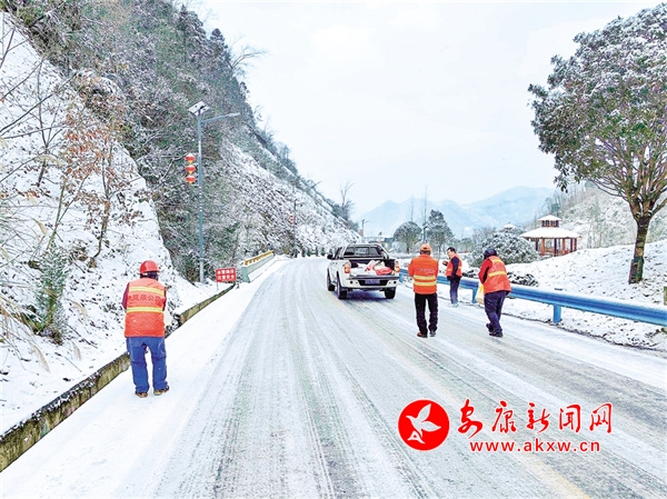 養(yǎng)護道工在G541國道柏枝埡隧道洞口附近拋灑融雪劑 劉翔 攝