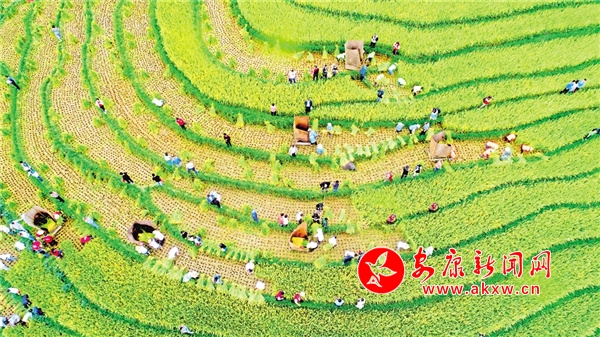 從空中俯瞰,桂花村近千畝梯田形似一塊袈裟,稻谷豐收時(shí),躍入眼簾的金色稻浪成為這個季節(jié)最美的風(fēng)景。