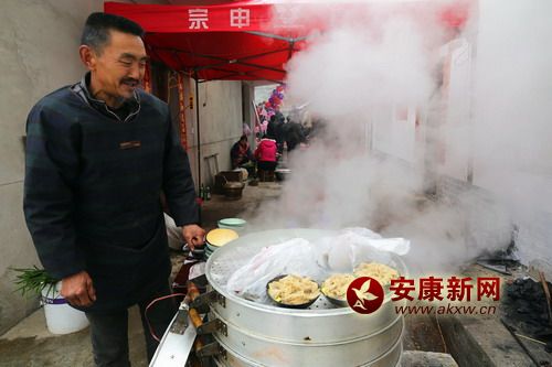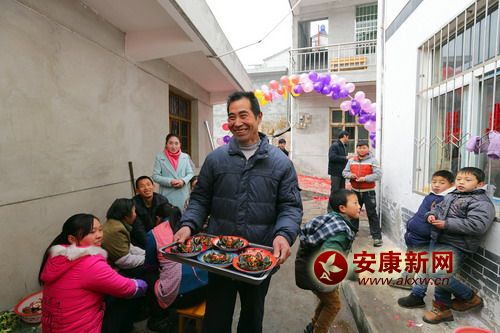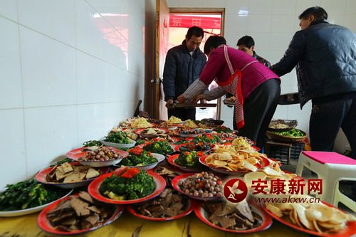 這時,新郎家是最熱鬧的,為了辦好婚禮,附近的親朋好友一一前來幫忙和捧人氣。新郎的家里搭起了氣球彩門,紅紅的對聯(lián)和喜字分別貼在窗戶和門上,院壩里架起了大蒸籠,八大碗早就上了籠,涼菜在案板上整整齊齊的一溜溜擺著;ㄉ、瓜子、糖果一一擺在屋子里、院壩里的十來張大圓桌上。按照墻上貼著的執(zhí)事單的安排,廚房、客廳、禮房等每個角落的人都在干著自己的事情。寒冬里的婚禮,沒有人喊累,嚴寒在這一刻被驅(qū)散。