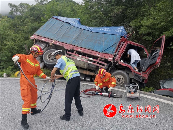 受西漢高速路面養(yǎng)護施工,貨車實施交通管制影響, 210國道貨運車輛激增,交通安全形勢突然嚴峻。7月17日中午13時許,一輛倉柵式輕型貨車滿載一車貨物,由成都沿210國道前往河南,行駛至210國道1392公里+100米處與道路左側山體碰撞,車頭被撞癟,駕駛員下半身被卡在駕駛室無法脫困,生命垂危。副駕駛被甩出車外。接警后廣貨街中隊迅速出警,第一時間趕到現(xiàn)場,迅速組織各救援單位開展施救。隨后,醫(yī)護人員、消防官兵、保險業(yè)務員先后到達,四家單位有條不紊地聯(lián)合救援即刻展開。交通警察對事故路段臨時性實施交通管制,防止發(fā)生次生事故。同時配合消防官兵對卡在車內(nèi)的駕駛人進行施救。醫(yī)護人員對傷員進行前期救治,包扎、輸液、輸氧。保險公司派出救援車輛對遺散的貨物進行收集,對受困車輛進行施救。歷時兩個小時,受困人員被救出,送醫(yī)院治療。