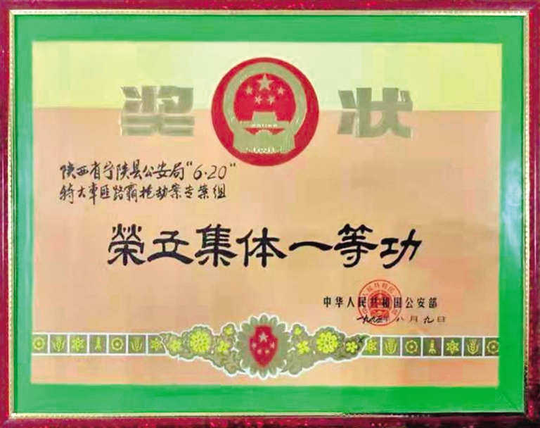 和往常一樣,我正和管理檔案的陳姨一起整理資料,忽然被眼前一塊榮立集體一等功的獎狀吸引,仔細(xì)查看,發(fā)現(xiàn)上面的詳細(xì)內(nèi)容是:陜西省寧陜縣公安局“6.20”特大車匪路霸搶劫案專案組榮立集體一等功,落款是中華人民共和國公安部,時間是1995年8月9日。