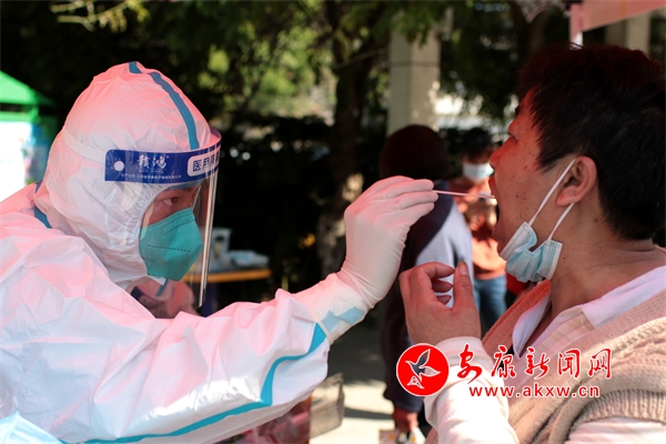 在城北社區(qū)幸福花園核酸檢測(cè)采樣點(diǎn),核酸采樣正在井然有序地進(jìn)行著。醫(yī)護(hù)人員全副武裝,溫柔輕聲引導(dǎo),手上動(dòng)作不停,按照核酸檢測(cè)采樣要求,嫻熟地對(duì)前來核酸檢測(cè)的群眾進(jìn)行咽拭子采樣。