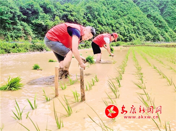 本網(wǎng)訊(通訊員 陳陽軍)農(nóng)忙時節(jié)不等人。不久前,地處秦嶺腹地的寧陜縣龍王鎮(zhèn)棋盤村,有一群人,他們身穿“紅馬甲”搶抓好時節(jié)移栽秧苗,在水田里來回穿梭,幫助村民把一株株秧苗整齊有序地插入水田里,在藍(lán)天白云的映襯下,田間地頭呈現(xiàn)出一幅忙碌的夏耕畫卷。