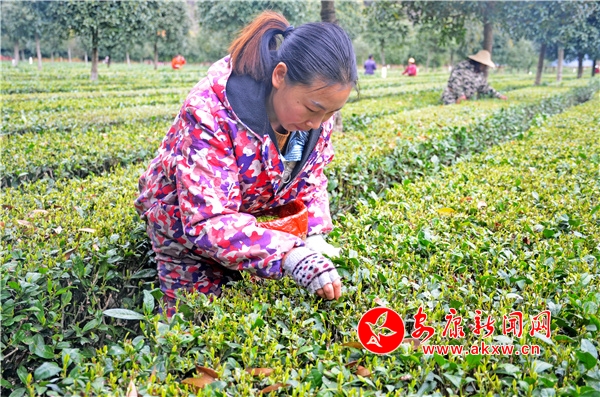 在儒林堡村千畝高效茶園,茶芽擠滿梢頭,青翠欲滴,茶香沁人心脾,采茶工人穿梭在生機盎然的茶園里,十指翻飛,熟練地掐采新茶嫩芽。一個小時的功夫,茶農(nóng)的茶簍里已裝了大半框嫩芽。