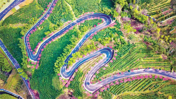 沿著茶山步道拾級而上,茶農(nóng)采青的竹簍與游人拍照的紗巾在梯田間次第閃現(xiàn)。粉白相間的梅花如云絮般綴滿枝頭,風(fēng)過處,花瓣簌簌落入茶叢,為嫩綠的新芽染上淡淡馨香。遠處黛瓦白墻的徽派民居與近處起伏的茶壟構(gòu)成天然畫框,無人機視角下,蜿蜒的茶道如同玉帶纏繞山腰,將紅楓、櫻花、梅林串成斑斕的珠鏈。