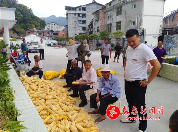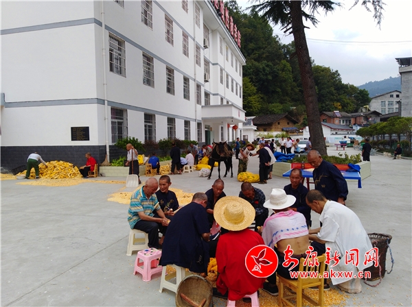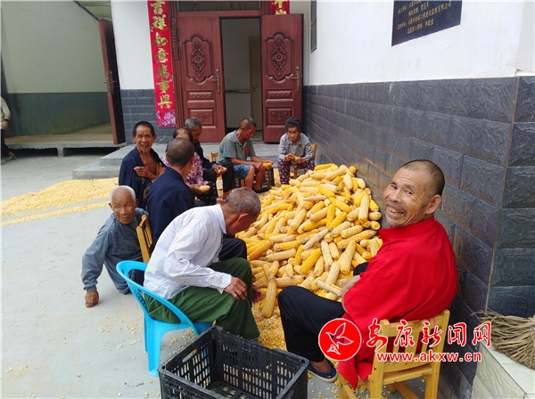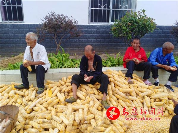 一大早,敬老院的費院長就安排院內(nèi)2位職工到玉米地組織工人采收玉米。為了安全起見,院內(nèi)有勞動能力的老人沒有安排外出采收,而是負責在敬老院內(nèi)組織人員剝玉米、晾曬。工人吆喝著騾子隊拖著一筐筐玉米回到敬老院,李建國等幾個有勞動能力的五保老人就過來搭手,將一筐筐玉米攤放在院場內(nèi)晾曬。工作人員和其他的五保老人一起,紛紛參與到剝玉米的行列,院場中堆滿了金燦燦的玉米,老人們個個拿著玉米棒子正在脫粒。今年的玉米大豐收,個個玉米棒子顆粒飽滿,顏色金黃誘人。大家忙活著,露出豐收的喜悅。