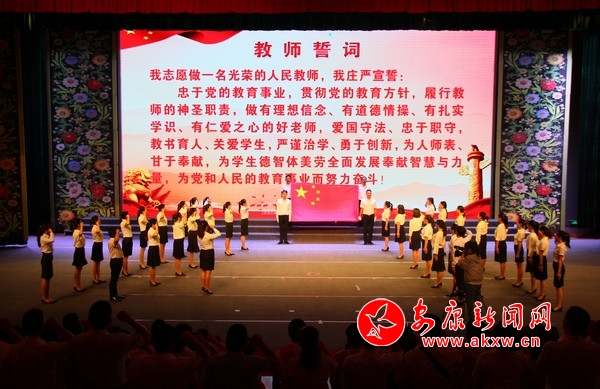 演出現(xiàn)場,對石泉中學(xué)等10 個“一流教育質(zhì)量單位”,李超旗等10名一流學(xué)校校長,陳興蘭等30名“一流教學(xué)能手”,楊細(xì)雨等50 名“三愛標(biāo)兵”進(jìn)行了表彰獎勵,2019年新入職的教師代表進(jìn)行了宣誓,老教師重溫了誓詞。