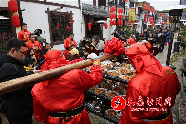 庖湯會(huì)菜品28道,八涼六熱十二道蒸菜兩道湯。美食不斷登場(chǎng)上桌的同時(shí),兩名披紅掛彩的當(dāng)?shù)匦』镒釉谘缦习ぷ辣硌蓐兡细鞣N花拳,把庖湯會(huì)的氣氛推向高潮。古鎮(zhèn)長(zhǎng)街、方桌條凳、游客們和當(dāng)?shù)厝罕妵谝黄,端起大黑碗,喝一口自釀美酒、吃一塊當(dāng)?shù)刎i肉、劃一局石泉花拳。