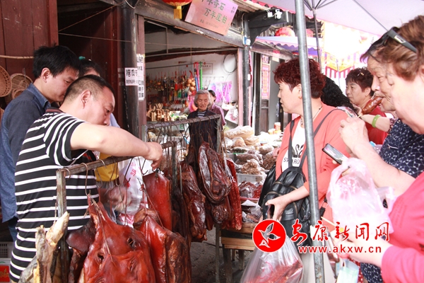 在古街中段,有兩間不大的老式建筑門面,門面掛著一個(gè)刻有“千年奇石萬年崖柏”的牌匾。店內(nèi)的貨柜貨架上陳列著奇石、崖柏、文玩等工藝品,而在店門口卻整齊地?cái)[列著各種土特產(chǎn),一個(gè)橫架子上掛滿了臘肉、香腸,正是這些不起眼的干貨、臘肉吸引了游客圍著一圈駐足品嘗購(gòu)買。