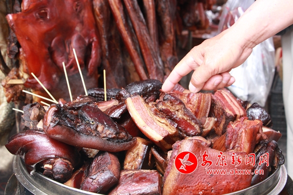 “這個(gè)你把它燒一下,用溫水泡一下,一洗就干凈了。你這個(gè)買回去掛在通風(fēng)的地方,想吃了隨時(shí)都可以自己做。”李明東一家人正圍著臘肉攤位忙得不可開交。