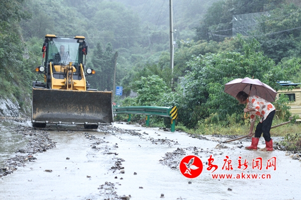 “我是自愿出來清掃道路的,雨這么大,干部忙不過來,我也想干點啥。”住在集鎮(zhèn)社區(qū)的王永芝說道。她主動拿起掃把,戴著雨帽,清掃著山腳下的碎石和泥水。