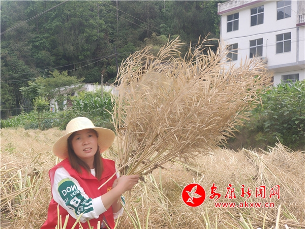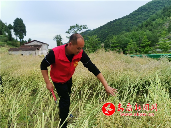 在油菜地里,朱貴武手持鐮刀,向參加勞動的同志講解,“握刀柄的力度要恰當(dāng),松了刀會脫手,緊了可能把自己給傷了,同時要注意腳底下的茬子,不要摔倒了,干農(nóng)戶沒多大的技巧,要自己去熟悉掌握,要多看下種地老前輩是怎么做的”。