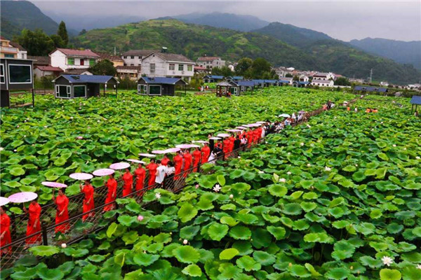 在石泉縣池河鎮(zhèn)五愛村,群眾正在進(jìn)行荷田旗袍秀。龔仕建攝