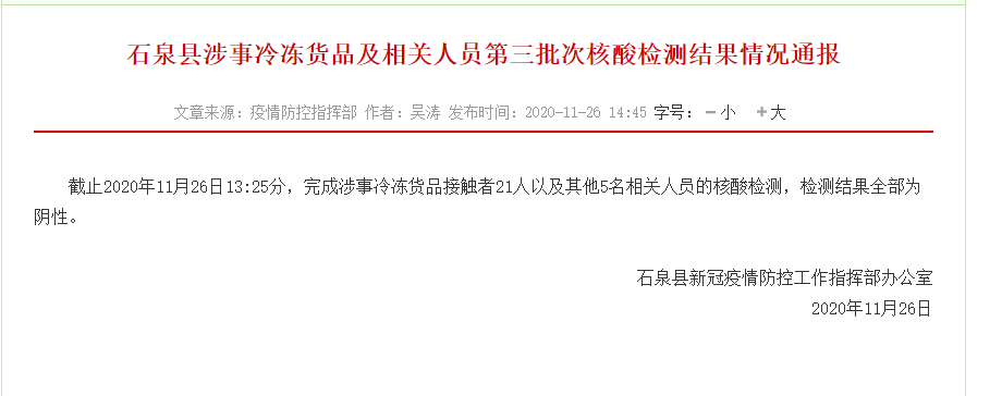 截止2020年11月26日13:25分,完成涉事冷凍貨品接觸者21人以及其他5名相關(guān)人員的核酸檢測,檢測結(jié)果全部為陰性。Pyy安康新聞網(wǎng)