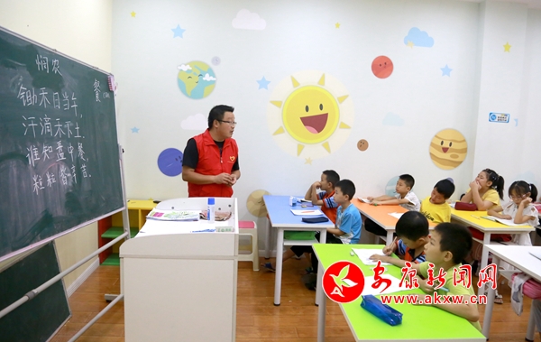 8月14日,石泉縣池河鎮(zhèn)西苑社區(qū)大學(xué)生志愿者正在為暑期免費輔導(dǎo)班學(xué)生講解《憫農(nóng)》,教育孩子們勤儉節(jié)約。孩子們通過講解父母或自己參與勞作的感受,體會了“汗滴……
