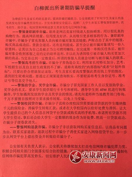安康新聞網(wǎng)訊(通訊員 康倩)暑假,本是學生放松與家人相聚的溫馨時刻,但年年暑假都有很多不法分子,鉆了學生涉世未深,輕易相信他人的空子,對學生實施諸如發(fā)放助學金、暑期兼職等類型的電信詐騙。對此白柳派出所專門針對此類電信詐騙在轄區(qū)進行了廣泛宣傳,不僅學生需注意,家長更需警惕。