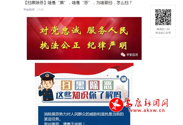 群眾“分段式”宣傳。根據(jù)轄區(qū)群眾各年齡段情況采取讓該年齡段人群容易接受的宣傳方式。對(duì)于年齡在20歲至45歲之間的年輕群體,依托各村警務(wù)群、“平安呂河”微信公眾平臺(tái)和“呂河警務(wù)聯(lián)動(dòng)平臺(tái)”微信朋友圈等新媒體不斷推送“掃黑除惡”專項(xiàng)斗爭法律知識(shí)。對(duì)于年齡在45歲以上的人群,專門開通了短信平臺(tái),實(shí)行“點(diǎn)對(duì)點(diǎn)”宣傳,形成了宣傳“全覆蓋”。