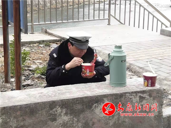 和她一樣的女漢子還有活躍在縣醫(yī)院十字路口處的王金、向婷,站在崗位上一刻她們就要圓滿完成這一刻的任務(wù)。疏導(dǎo)行人和車輛,確?h醫(yī)院應(yīng)急通道的暢通,在她們心里那就是天職,連吃飯也一直在附近移動(dòng)警務(wù)車?yán)镙喠骰鹚俳鉀Q。