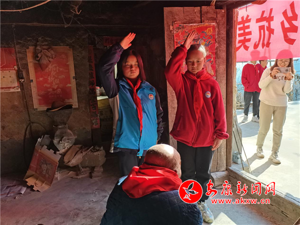 “雄赳赳,氣昂昂,跨過鴨綠江。保和平,衛(wèi)祖國,就是保家鄉(xiāng)……”迎著冬日的暖陽,伴隨著嘹亮的歌聲,尋訪組鮮艷的黨旗、團旗、隊旗在全嶺村的田間地頭,迎風(fēng)招展,烈烈飛揚,在學(xué)校老師的帶領(lǐng)下,同學(xué)們帶著慰問品步履鏗鏘而又堅定地前往抗美援朝老志愿軍劉剛乾的家中。ynm安康新聞網(wǎng)