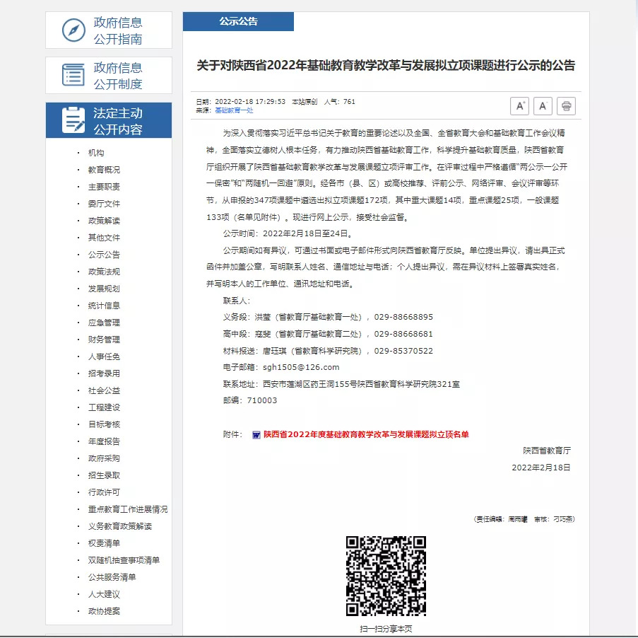 為了深入貫徹落實(shí)習(xí)近平總書記關(guān)于教育的重要論述以及全國、全省教育大會(huì)和基礎(chǔ)教育工作會(huì)議精神,全面落實(shí)立德樹人根本任務(wù),大力推動(dòng)陜西省基礎(chǔ)教育工作,科學(xué)提升基礎(chǔ)教育質(zhì)量,陜西省教育廳組織此次課題的評(píng)審和立項(xiàng)工作。本次立項(xiàng)課題172項(xiàng),是從申報(bào)的347項(xiàng)課題中遴選而出的。