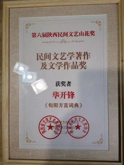 3月3日,第六屆“陜西民間文藝山花獎(jiǎng)”頒獎(jiǎng)典禮在陜歌大劇院隆重舉行。旬陽(yáng)市政協(xié)副主席、陜西省特級(jí)教師教學(xué)名師華開(kāi)鋒編撰的著作《旬陽(yáng)方言詞典》和王智編著的《關(guān)中老作坊》兩部作品榮獲民間文藝學(xué)著作及文學(xué)作品獎(jiǎng)。
