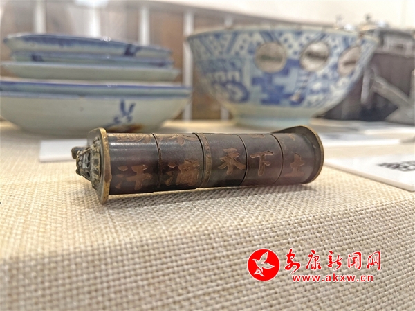 轉(zhuǎn)入內(nèi)間,是鎮(zhèn)史溯源板塊,大事紀(jì)要展板條理清晰,各類農(nóng)耕用具散布各處。其中一個(gè)玻璃展柜格外顯眼,展柜中一摞青花瓷碟碗痕跡斑駁,一把藏詩鎖靜靜躺在一旁。只見橫式的圓柱體銅鎖有5個(gè)撥輪,上面共有20個(gè)行書漢字,連讀起來正是唐詩《憫農(nóng)》,銅鎖表層有重度磨痕,但字跡依舊清晰,鎖的兩側(cè)均鑄成獅子頭狀。“想打開這把鎖先得有文化、會識字,還得知道語句特有的順序。”據(jù)這件銅鎖的捐贈者梁延介紹,這把密碼鎖是原屬于金寨一家大戶,是祖?zhèn)鞯奈锛䞍骸?span style="display:none">T5i安康新聞網(wǎng)