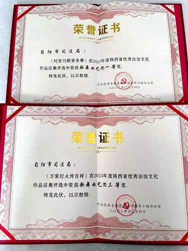 本網訊(通訊員 黃倩) 近日,陜西省委普法辦通報了2023年度全省優(yōu)秀法治文化作品獲獎名單,共評出5類132件獲獎作品,其中由旬陽市司法局選送的原創(chuàng)普法民歌劇《村官巧斷家務事》和漢調二黃歌舞《萬家燈火傳吉祥》分別榮獲歌舞曲藝類一等獎、三等獎。