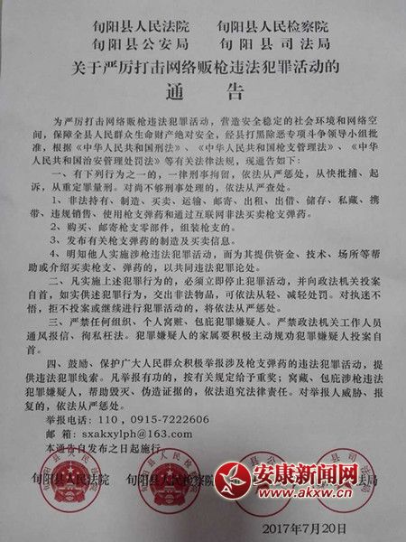 安康新聞網(wǎng)訊(通訊員 ?担7月20日,旬陽警方聯(lián)合法、檢、司部門共同發(fā)布了《關(guān)于嚴(yán)厲打擊網(wǎng)絡(luò)販槍違法犯罪活動(dòng)的通告》。從該縣警方了解到,發(fā)布此次《通告》……